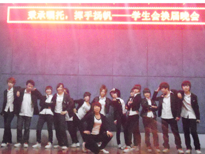 学生会各个部门都踊跃献艺,自律部演唱歌曲《爱因为在心中》,广播台的歌剧《我们小时候》,朗诵团的朗诵《80’90’》,宣传部的话剧《新还珠格格》,生活部的《甩葱舞》,学习部的歌曲《大笑江湖》,外联部的舞蹈串烧《神舞》,学通社的话剧《天堂地狱大比拼》,体育部和女生部联合排练的武术《太极》、《歌曲串烧》,文艺部的歌伴舞《Sorry Sorry》,办公室的话剧《非诚胡搞》,礼仪团的走秀《飞扬青春》。